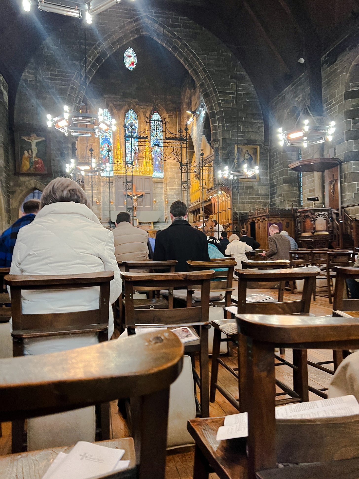 As I listened to this man’s words, my gaze went up to the stained-glass image of Christ on the throne; then my eyes fell to the foot of the altar to see him hanging from the cross. The King made low. The sinless man who stood silent before his accusers. The Son of God made so humbly accessible that he literally offers himself to me. Here. Now. In an old church in Scotland in 2025.